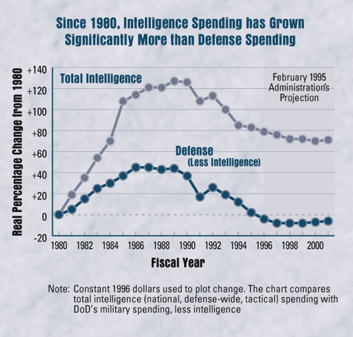 The Commission does not conclude the practice followed by successive Secretaries of Defense is necessarily right or wrong, but only that it has been the case. Nor does the Commission conclude that the wide disparity between intelligence spending and defense spending, relative to their 1980 levels, necessarily means that intelligence spending should be cut. But what, then, should be used to gauge the level of spending for intelligence?