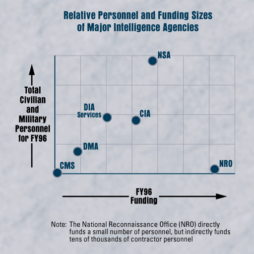Although intelligence funding remains classified, Figure 2 depicts the relative funding levels of the major intelligence agencies and their personnel levels for FY 1996. NSA, CIA, and DIA (and the Service intelligence units) have the largest number of personnel; the NRO, on the other hand, has the highest level of funding of any program in the Community, but virtually no federal workforce. Its work is accomplished primarily by contractors in the private sector.