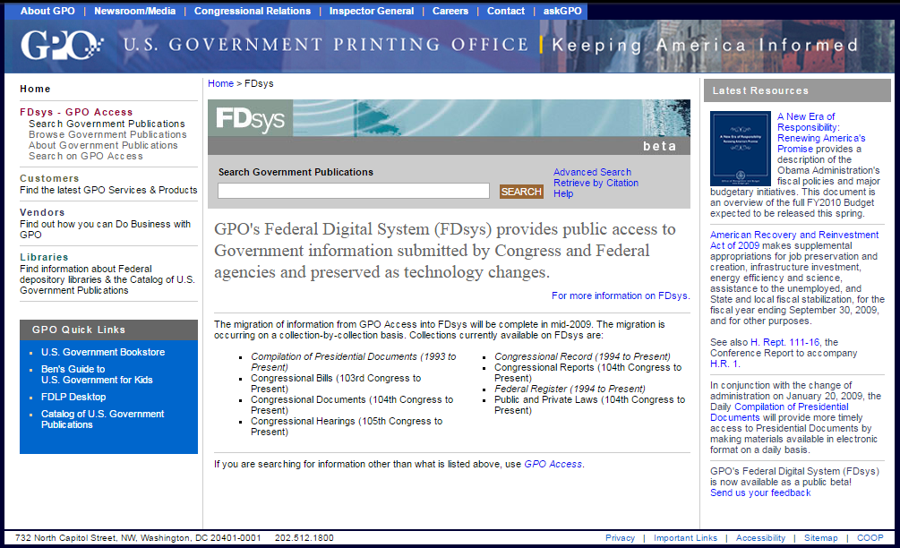 January 15, 2009- FDsys public website was launched as a beta in parallel with the existing GPO Access site. The site initially included content and XML metadata files for Congressional Bills, Calendars, Committee Prints, Hearings, Reports, Documents, Congressional Directory, Congressional RecFord, Public Laws, and United States Code. FDsys launched with more than 154,000 documents accessible. As part of FDsys, GPO began digitally signing all PDF files as part of the FDsys workflow.