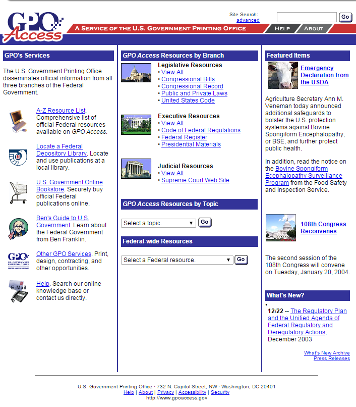 April 2003- In response to user feedback, GPO unveiled a major redesign of GPO Access. This interface introduced a consistent design and a means of navigating throughout the site.