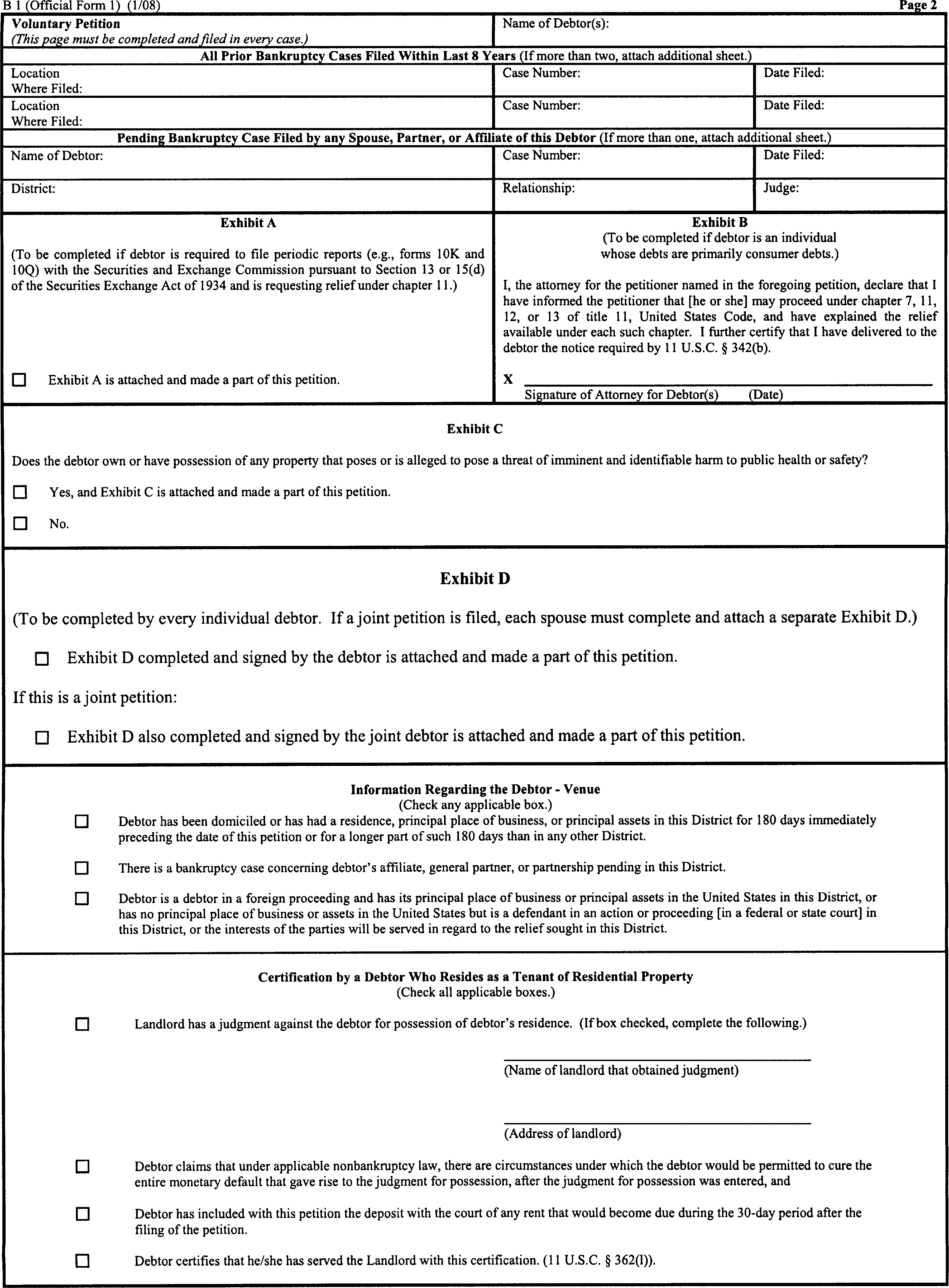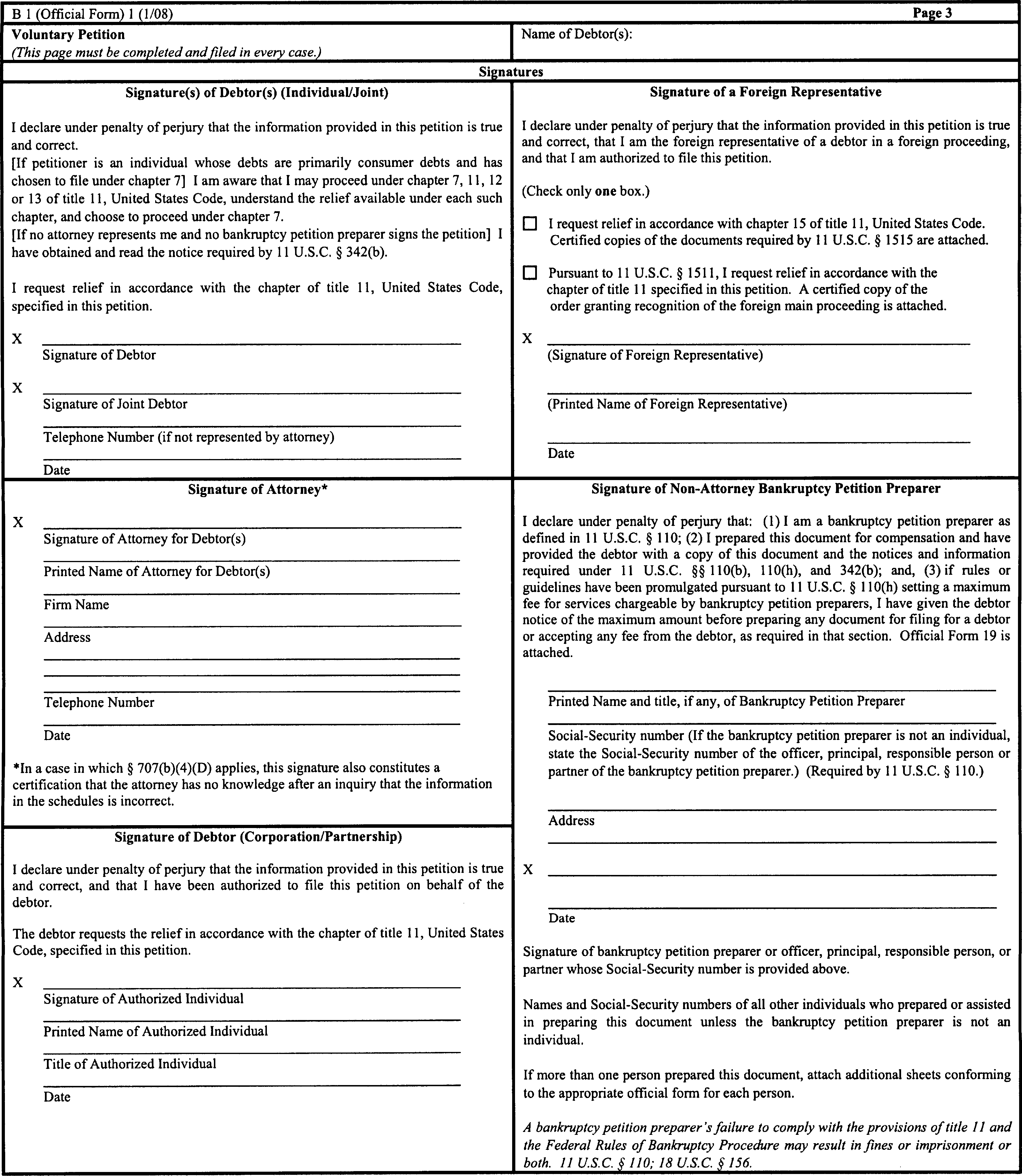 Official Form No. 1 may be used to seek relief voluntarily under any of the chapters. Only the original need be signed and verified, but the copies must be conformed to the original. See Rules 1008 and 9011(c). As provided in §362(a) of the Code, the filing of a petition acts as a stay of certain acts and proceedings against the debtor, property of the debtor, and property of the estate.