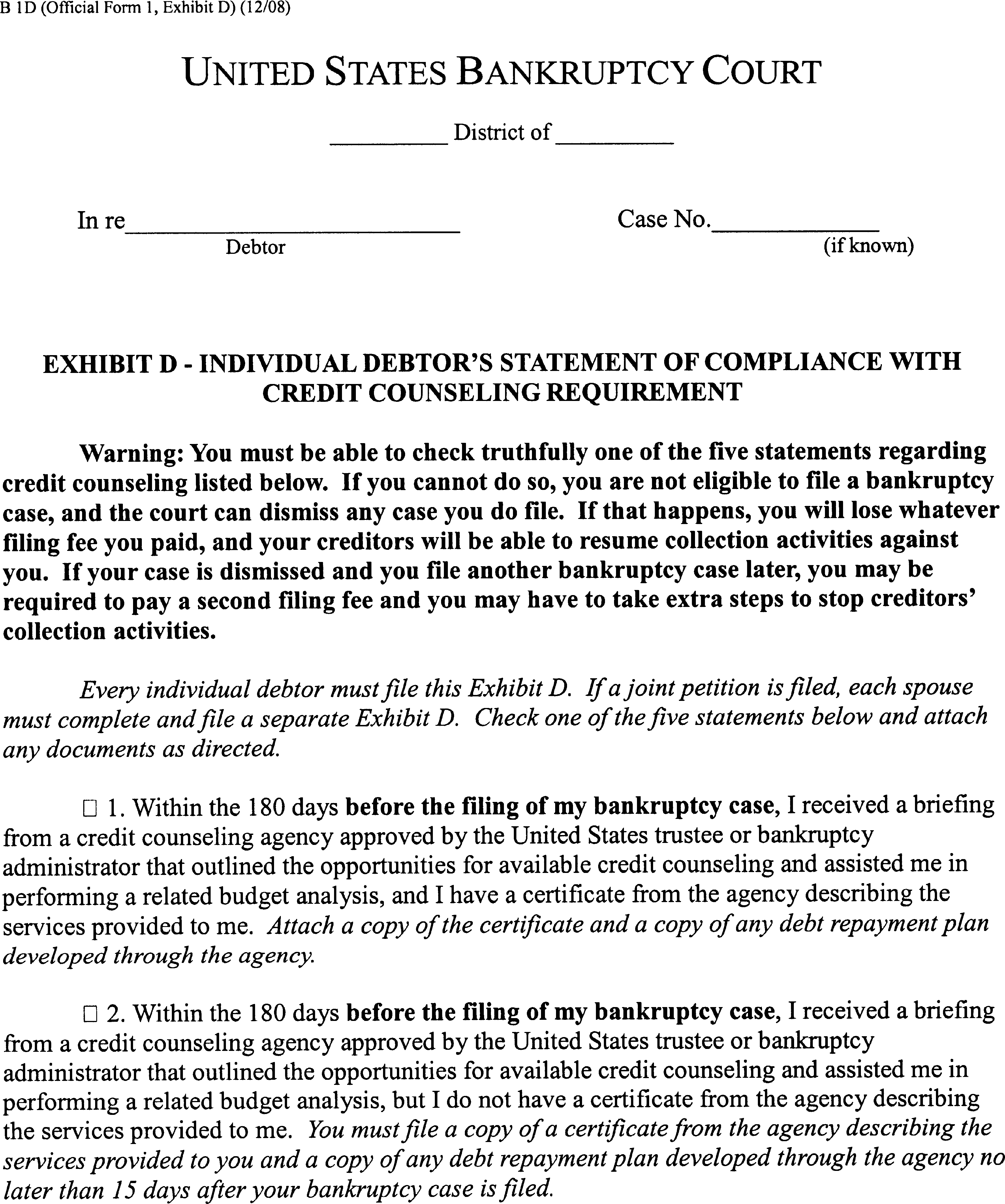 (3) Unless the United States trustee has determined that the credit counseling requirement of §109(h) does not apply in the district, an individual debtor must file a statement of compliance with the credit counseling requirement, prepared as prescribed by the appropriate Official Form which must include one of the following:
