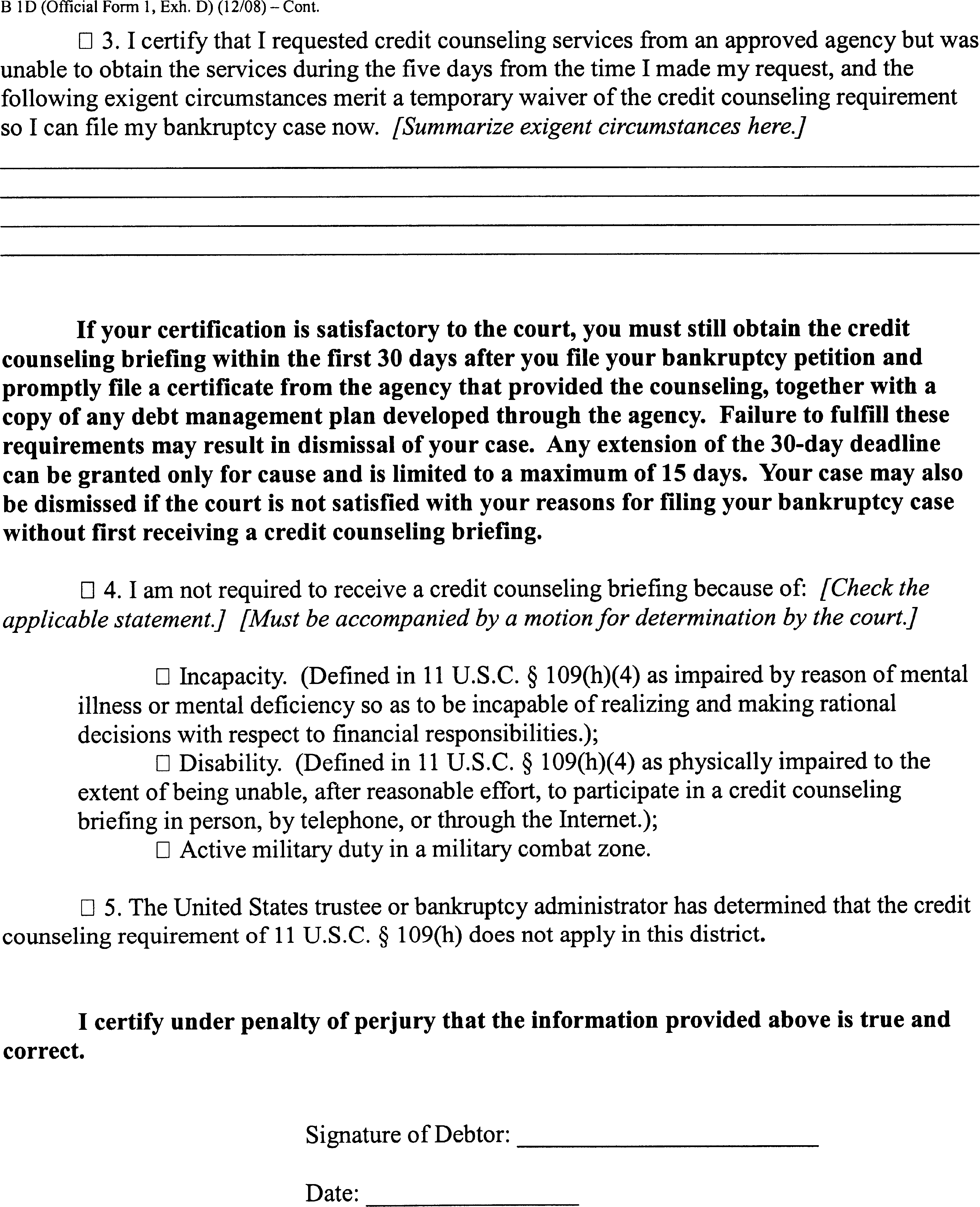 The form is amended to direct each individual debtor, including both spouses in a joint case, to file a separate certification and to provide the certificate number of the certificate of completion issued to the debtor by the approved personal financial management counselor. The form also is amended to include the deadlines for filing the certification in cases under chapters 7 and 13 and to instruct the debtor that the form is not to be used to file the certificate provided by the debtor's prepetition credit counselor.
