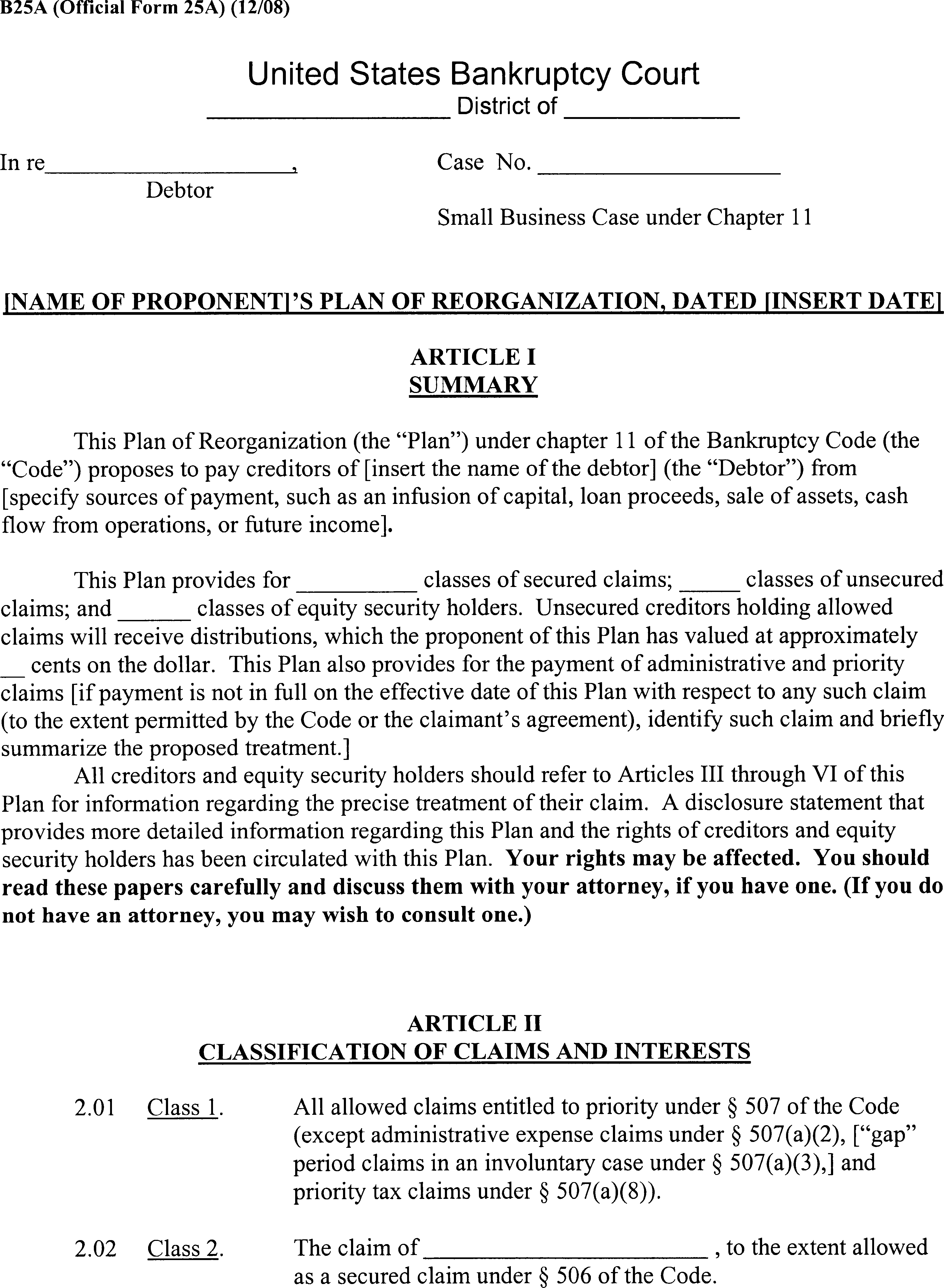 This form is new. It implements §433 of the Bankruptcy Abuse Prevention and Consumer Protection Act of 2005, Pub. L. No. 109–8, 119 Stat. 23 (April 20, 2005). This form for a small business chapter 11 plan of reorganization may be used in cases where the debtor (whether an individual or an artificial entity) is a small business debtor under §101(51D) of the Code. The form is intended to be used in conjunction with the small business chapter 11 disclosure statement form (Official Form 25B).