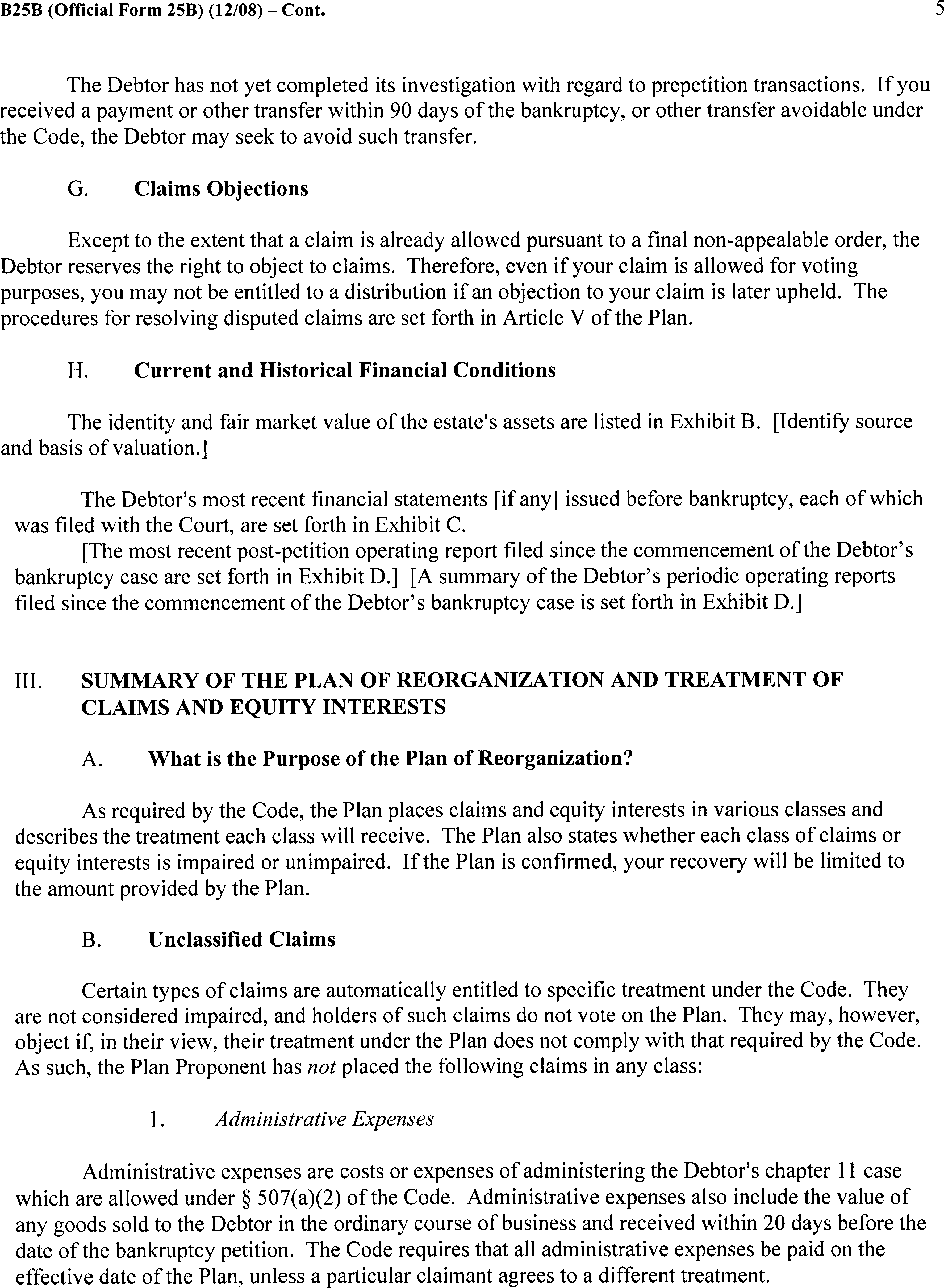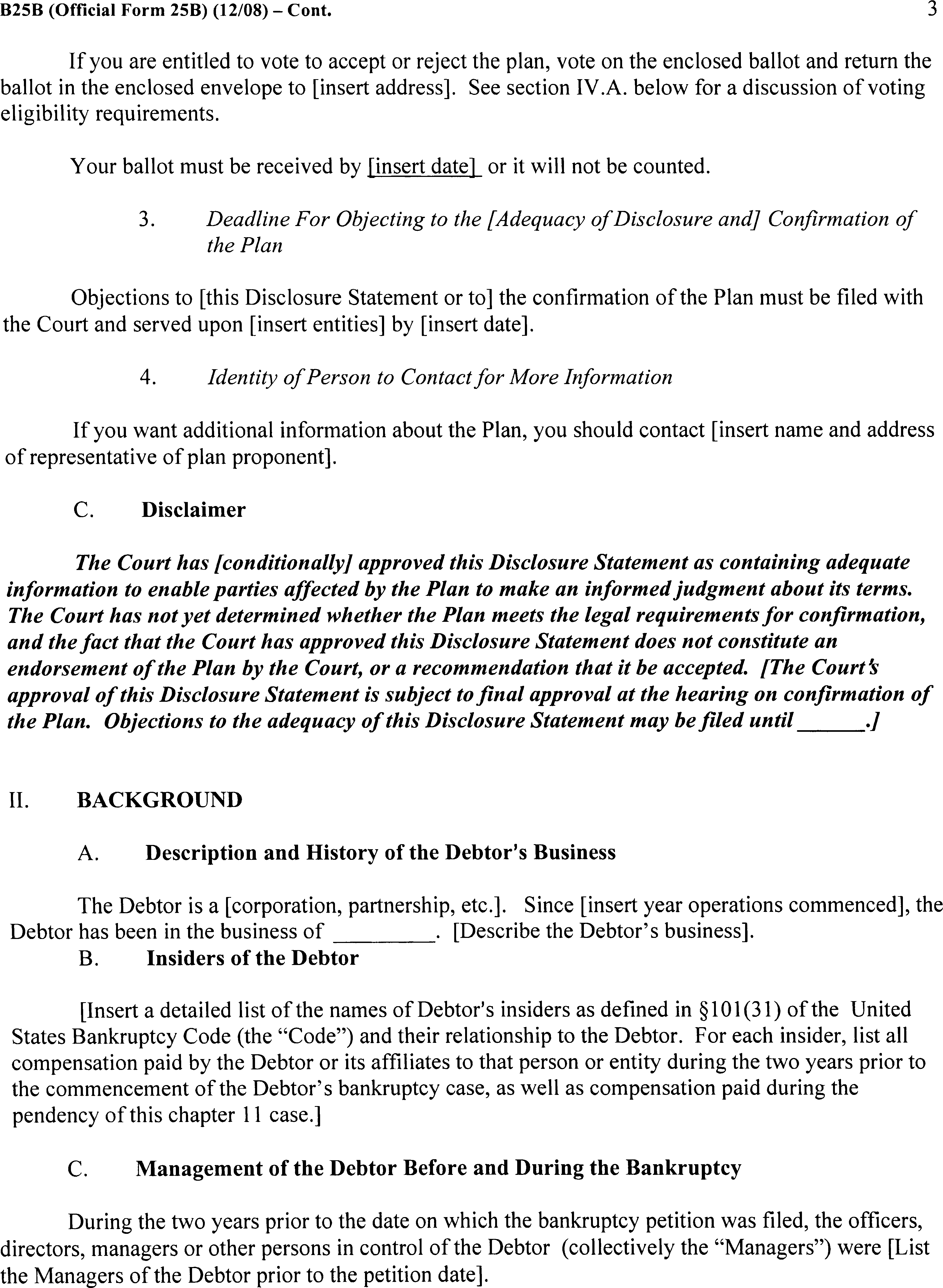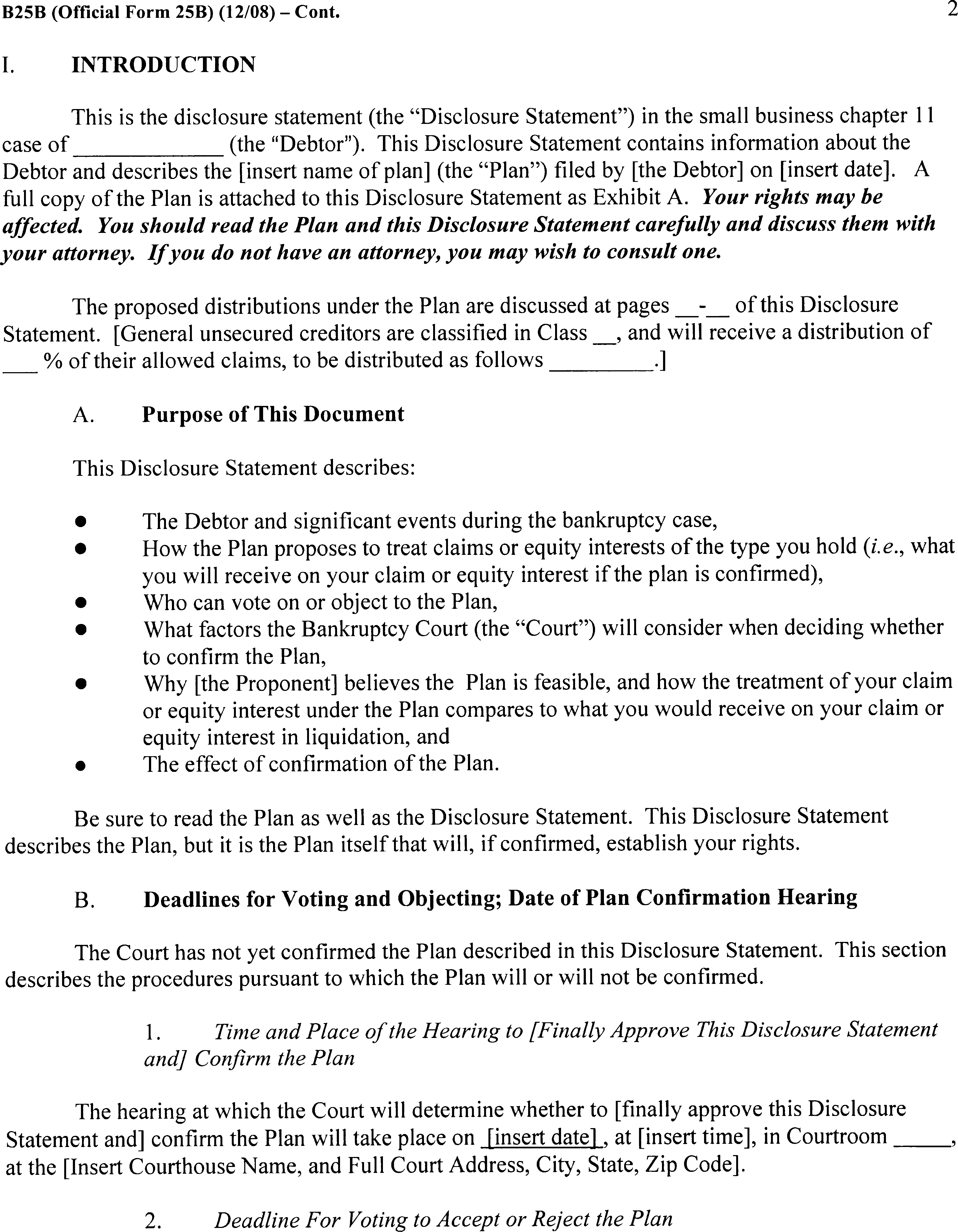 Because the relevant legal requirements for, and effect of, a plan's confirmation may vary depending on the nature of the debtor and the details of the proposed plan, this form is intended to provide an illustrative format for disclosure, rather than a specific prescription for the language or content of a particular disclosure statement. The form highlights the factual and legal disclosures required for adequate disclosure under §1125 of the Code. The form is not intended to restrict a plan proponent from providing additional information where that would be useful. Plan proponents are encouraged to present material information in as clear a manner as possible, including, where feasible, by providing an accompanying executive summary, approved by the court, that highlights particular creditors’ or interest holders’ voting status and treatment under the plan.