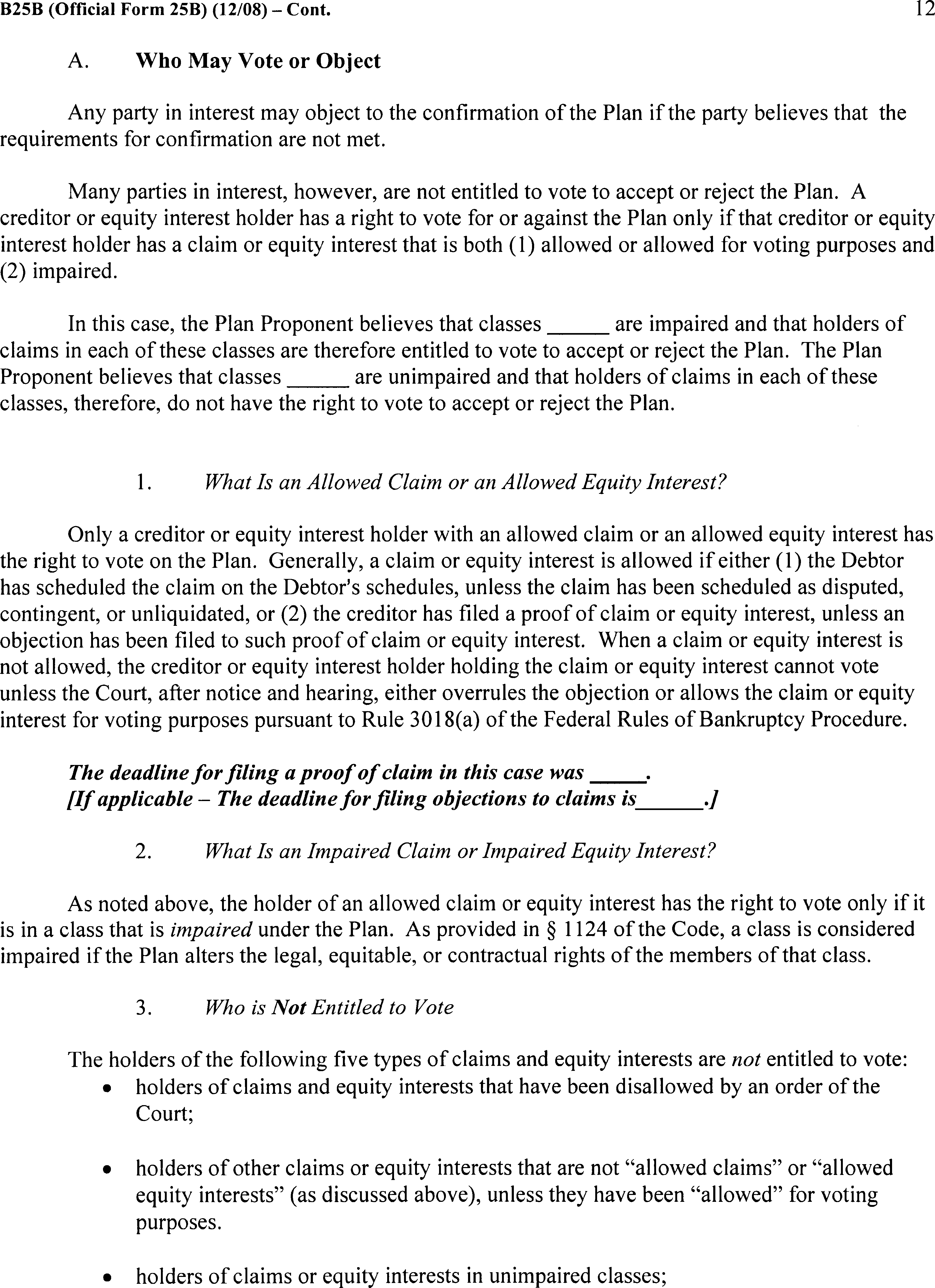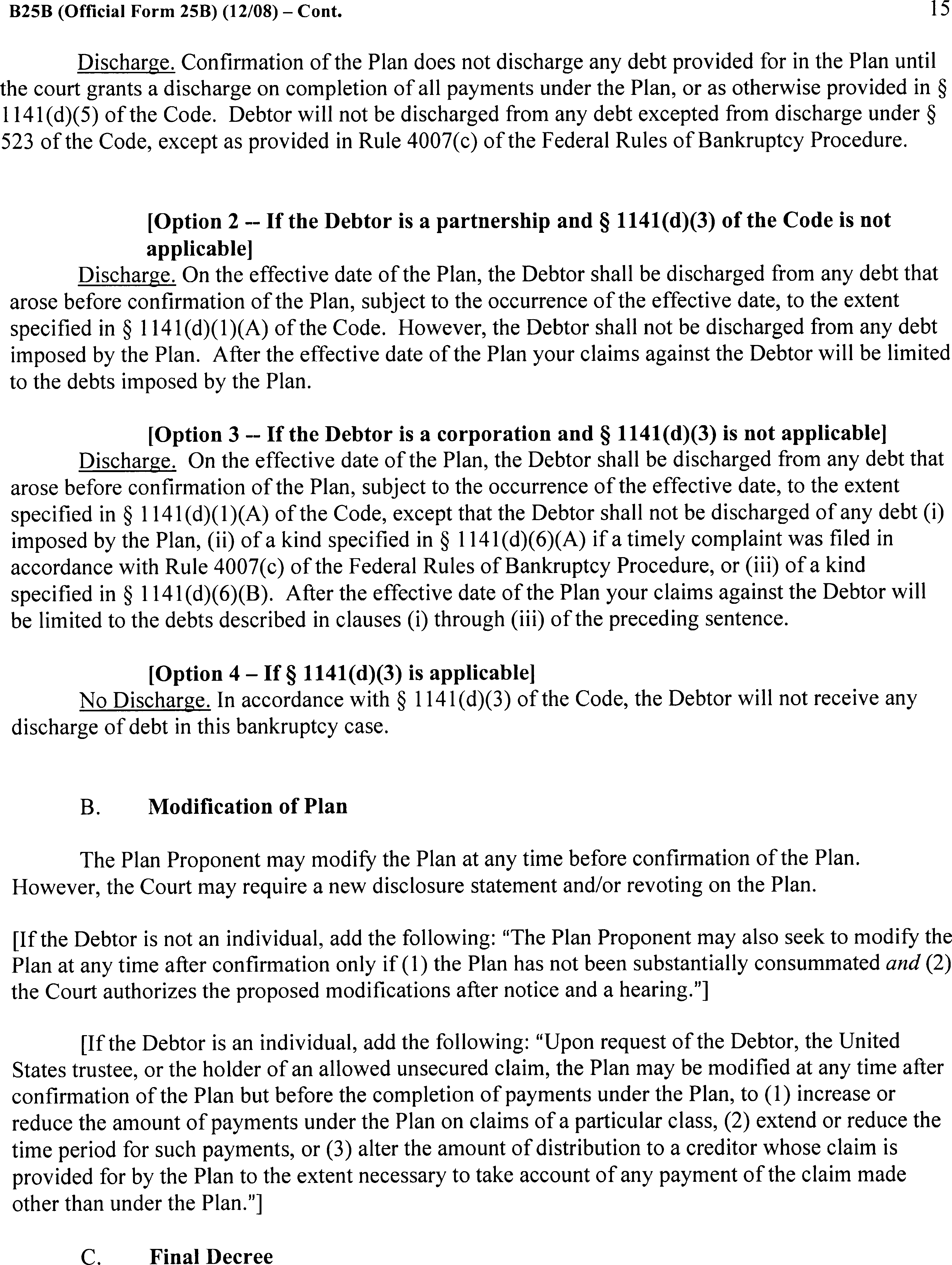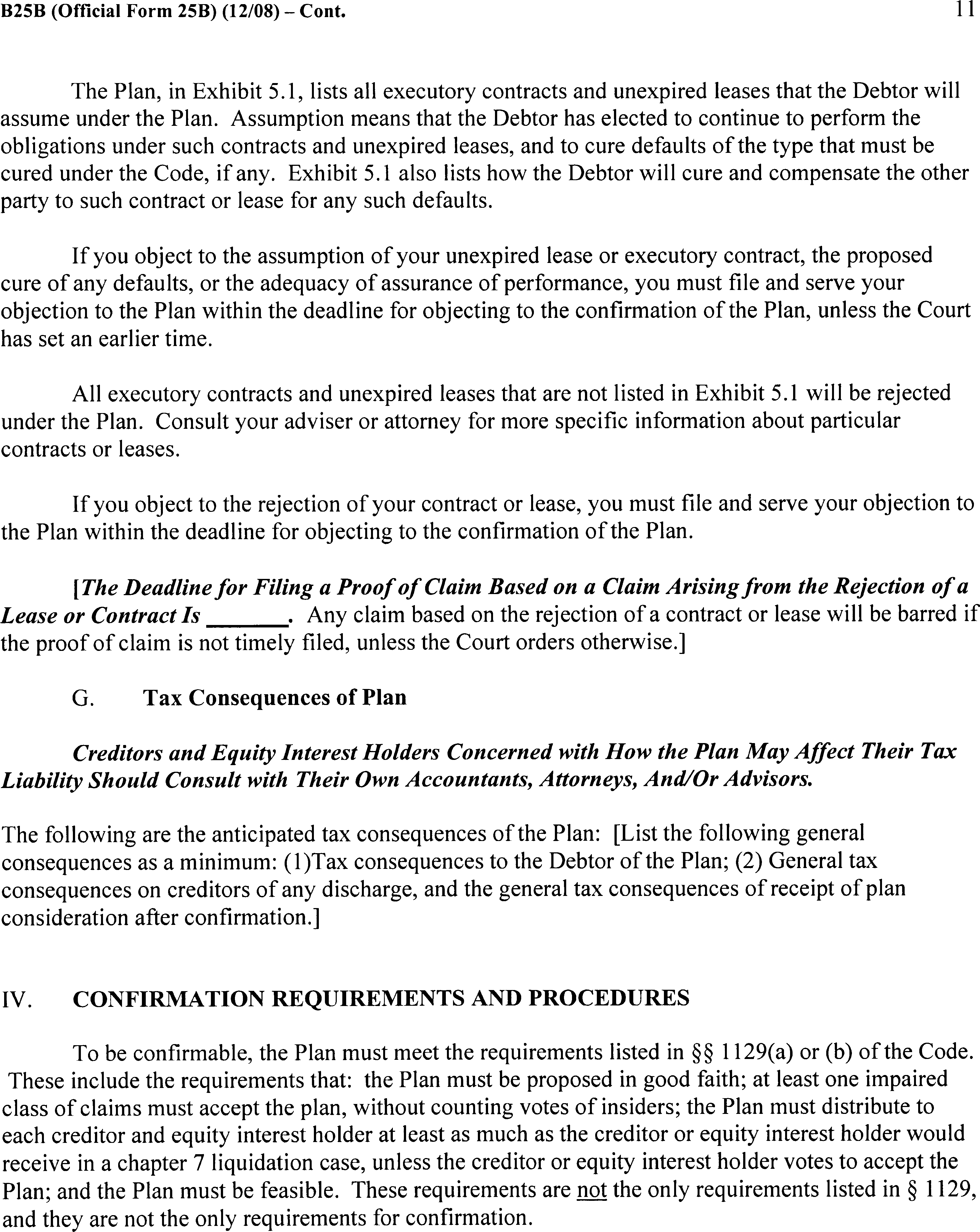 Because the relevant legal requirements for, and effect of, a plan's confirmation may vary depending on the nature of the debtor and the details of the proposed plan, this form is intended to provide an illustrative format for disclosure, rather than a specific prescription for the language or content of a particular disclosure statement. The form highlights the factual and legal disclosures required for adequate disclosure under §1125 of the Code. The form is not intended to restrict a plan proponent from providing additional information where that would be useful. Plan proponents are encouraged to present material information in as clear a manner as possible, including, where feasible, by providing an accompanying executive summary, approved by the court, that highlights particular creditors’ or interest holders’ voting status and treatment under the plan.