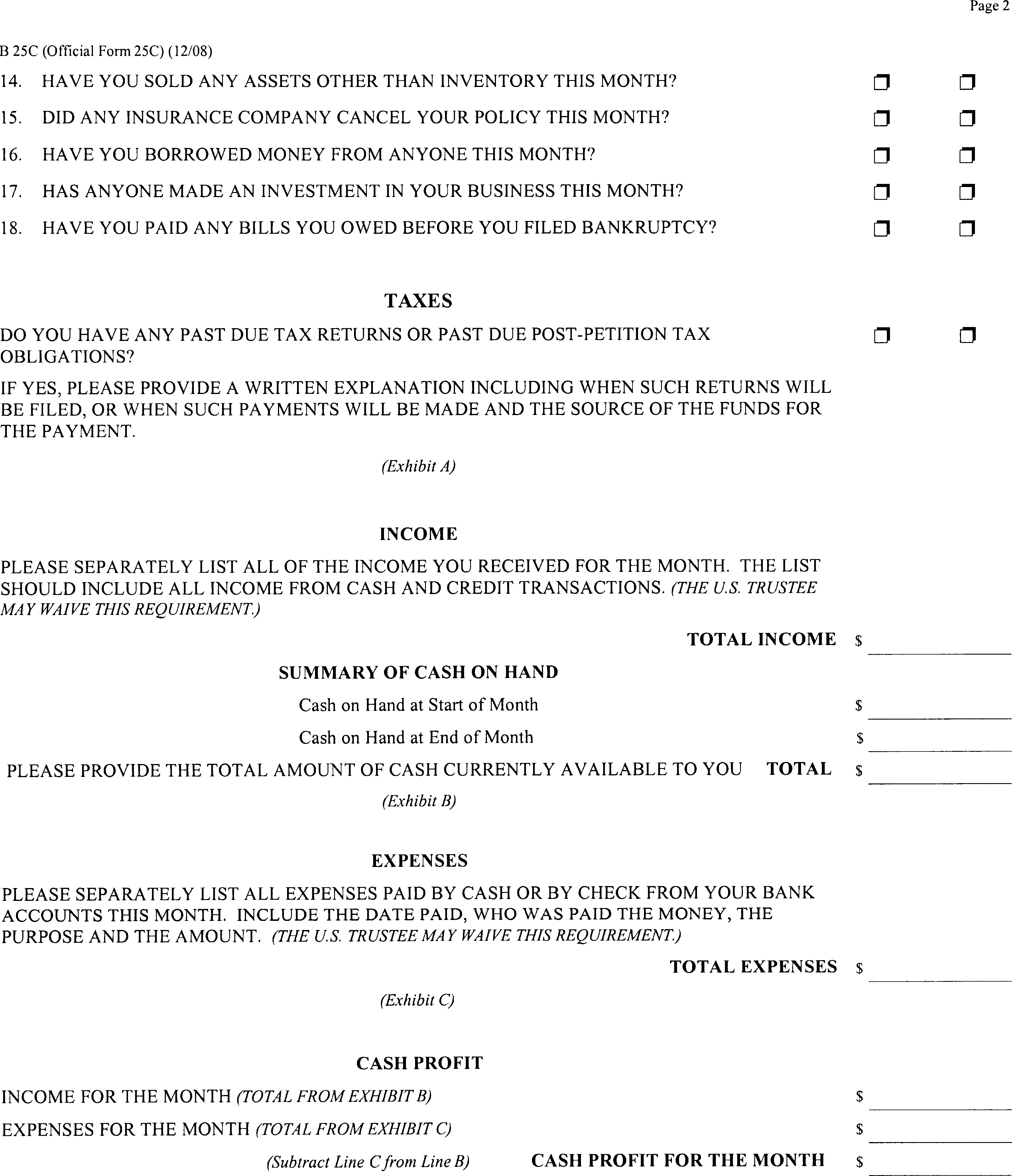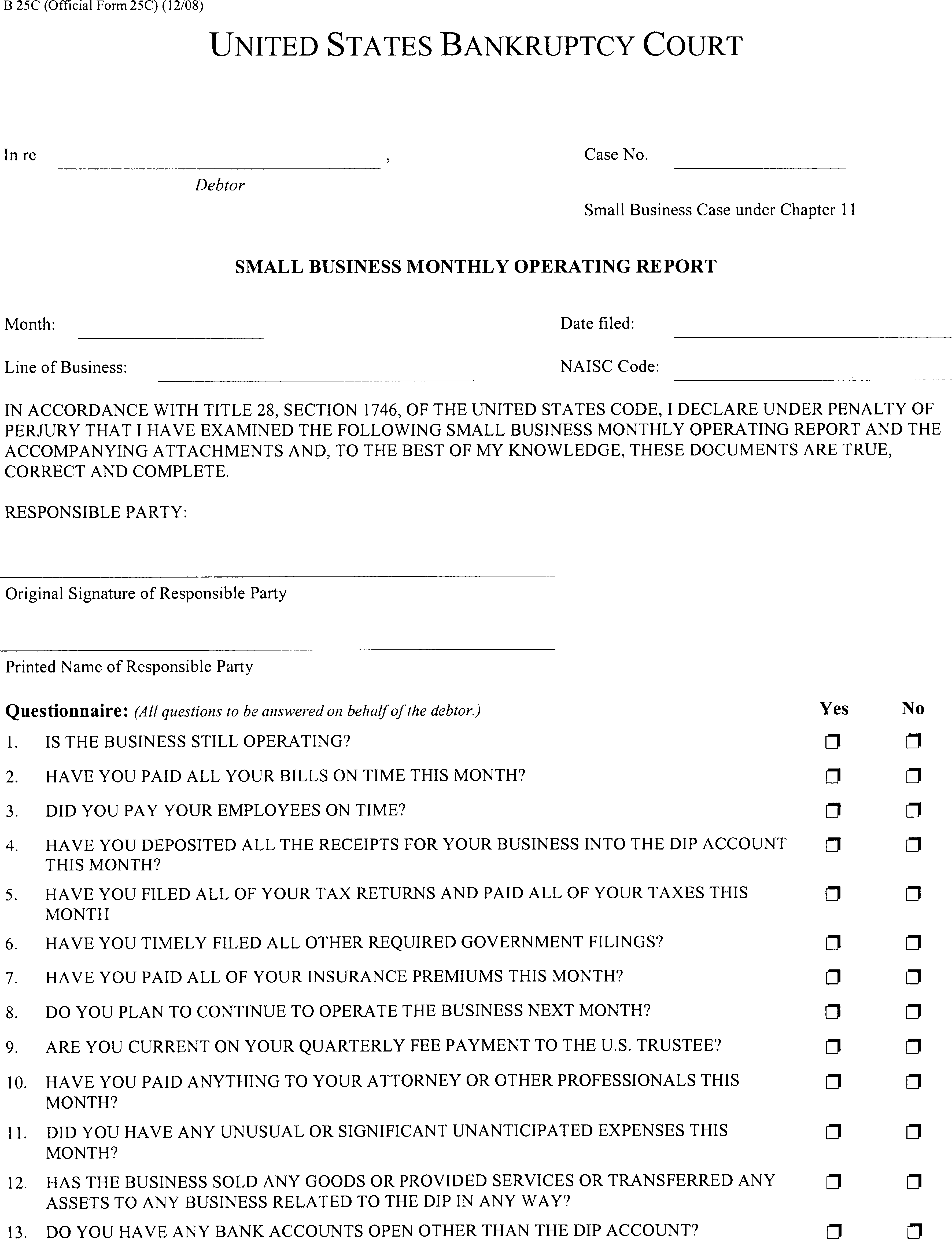 This form is new. It implements §§434 and 435 of the Bankruptcy Abuse Prevention and Consumer Protection Act of 2005, Pub. L. No. 109–8, 119 Stat. 23 (April 20, 2005), which provided for rules and an official form to assist small business debtors in chapter 11 cases to fulfill their responsibilities under §308 of the Code, a provision added by the 2005 Act. The form directs the debtor to disclose the information required under §308 and resembles those developed earlier by the United States trustees for use in supervising debtors in possession in chapter 11 cases.