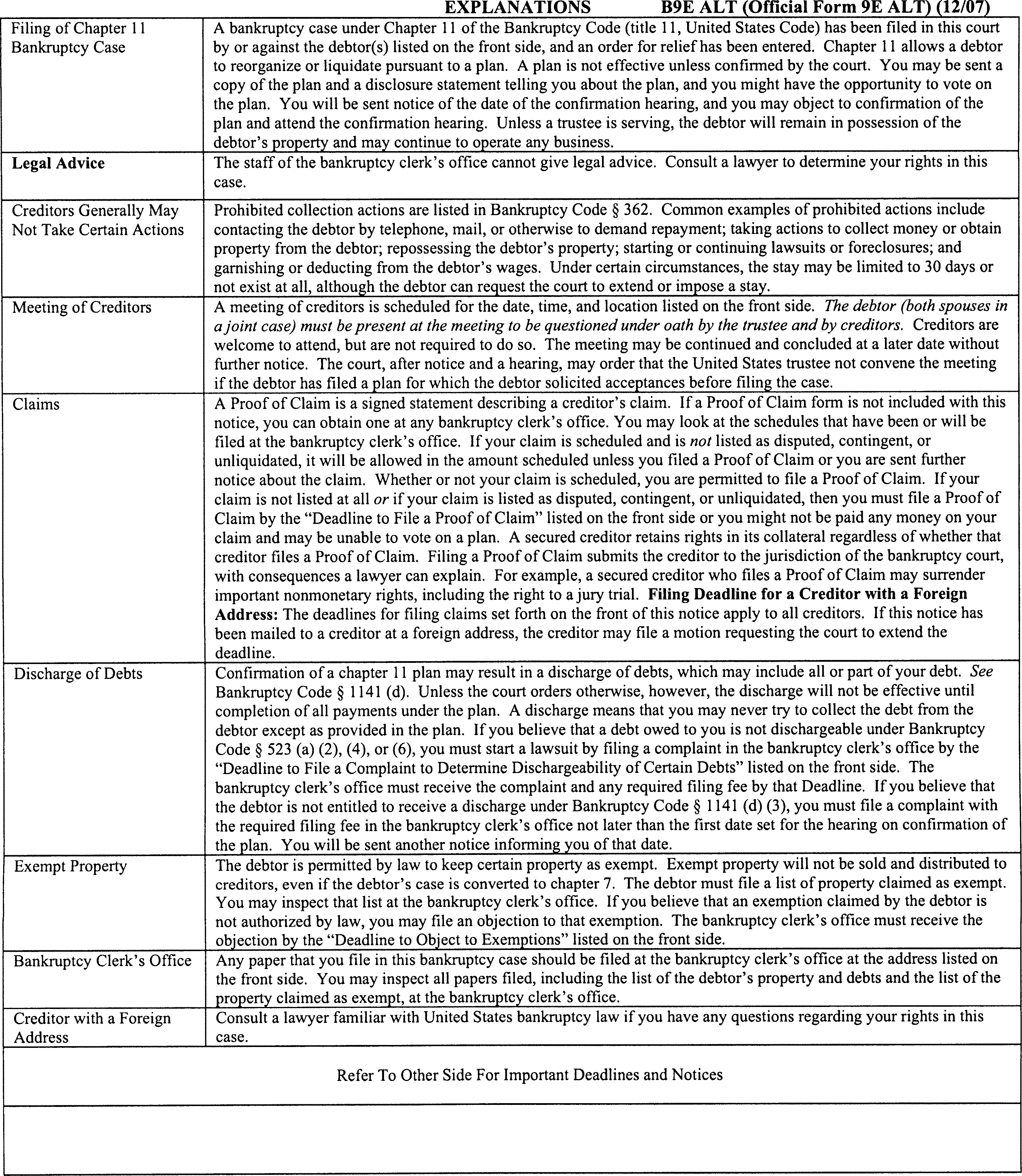 The form was issued in 2005. Sections 727(a)(11), 1141(d)(3) and 1328(g)(1), which were added to the Code by the Bankruptcy Abuse Prevention and Consumer Protection Act of 2005, Pub. L. No. 109–8, 119 Stat. 23 (April 20, 2005), require individual debtors to complete an instructional course concerning personal financial management as a condition for receiving a discharge. The completed form will signal the clerk that this condition has been satisfied. Each individual debtor, including both spouses in a joint case, must file a separate certification and provide the certificate number of the certificate of completion issued to the debtor by the approved personal financial management counselor. Instructions are included that state the deadlines for filing the certification in chapter 7, chapter 11 in which §1141(d)(3) applies, and chapter 13 cases, and remind the debtor that the form is not to be used for filing a certification of prepetition credit counseling.