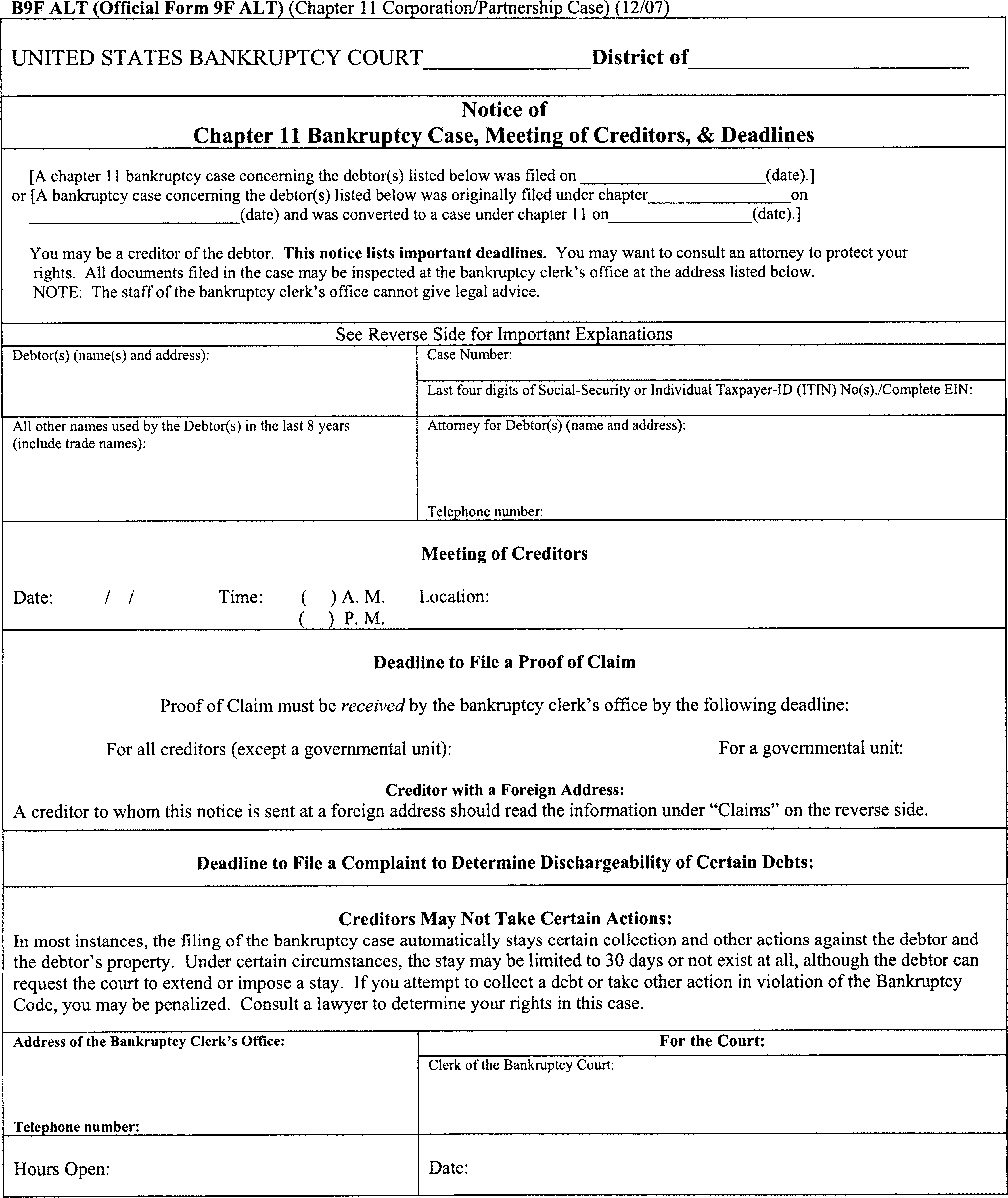 Subdivision (a). Official Form No. 11 (Involuntary Case: Creditors’ Petition), is prescribed for use by petitioning creditors to have a debtor's assets liquidated under chapter 7 of the Code or the business reorganized under chapter 11. It contains the required allegations as specified in §303(b) of the Code. Official Form 12 is prescribed for use by fewer than all the general partners to obtain relief for the partnership as governed by §303(b)(3) of the Code and Rule 1004(b).
