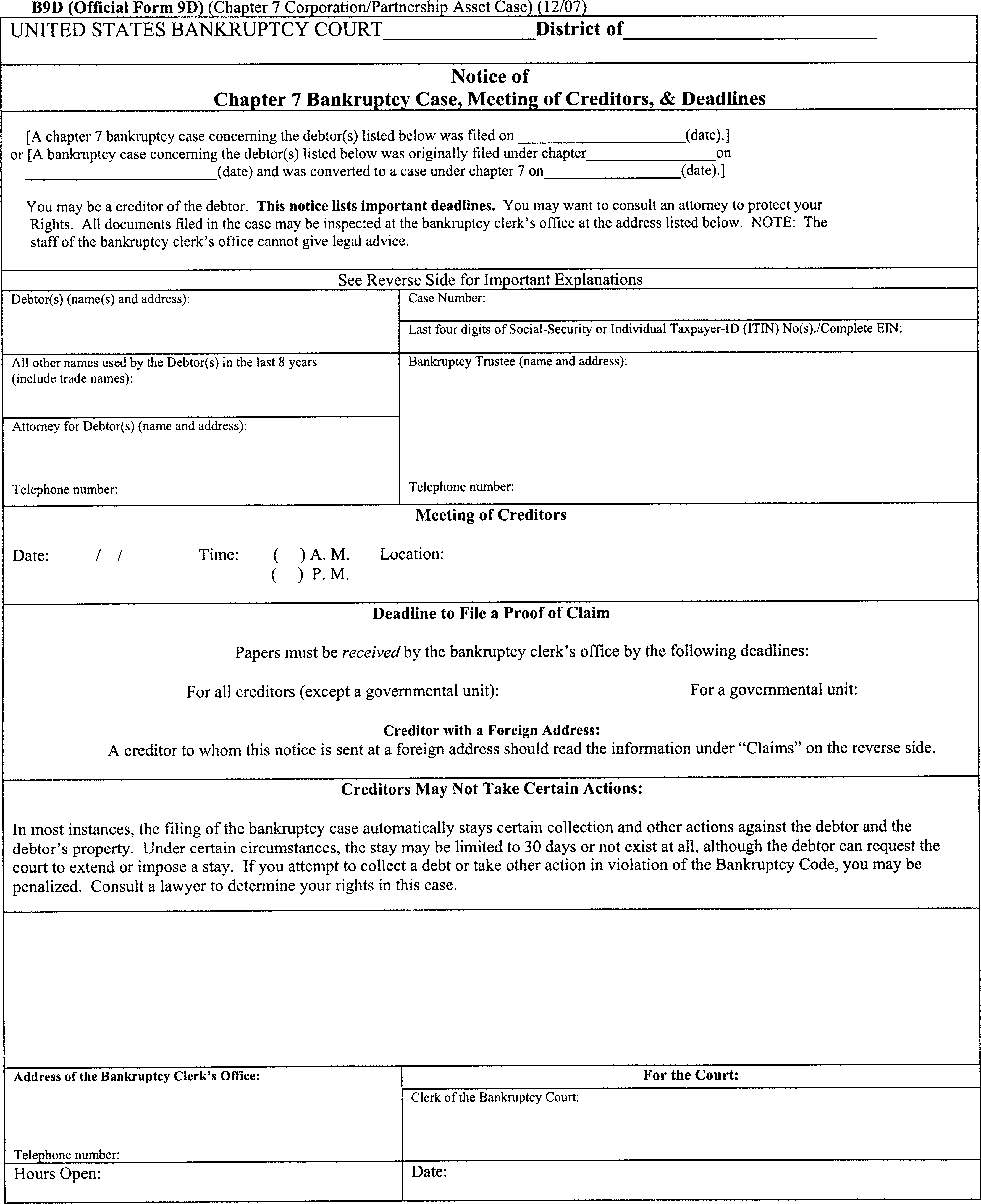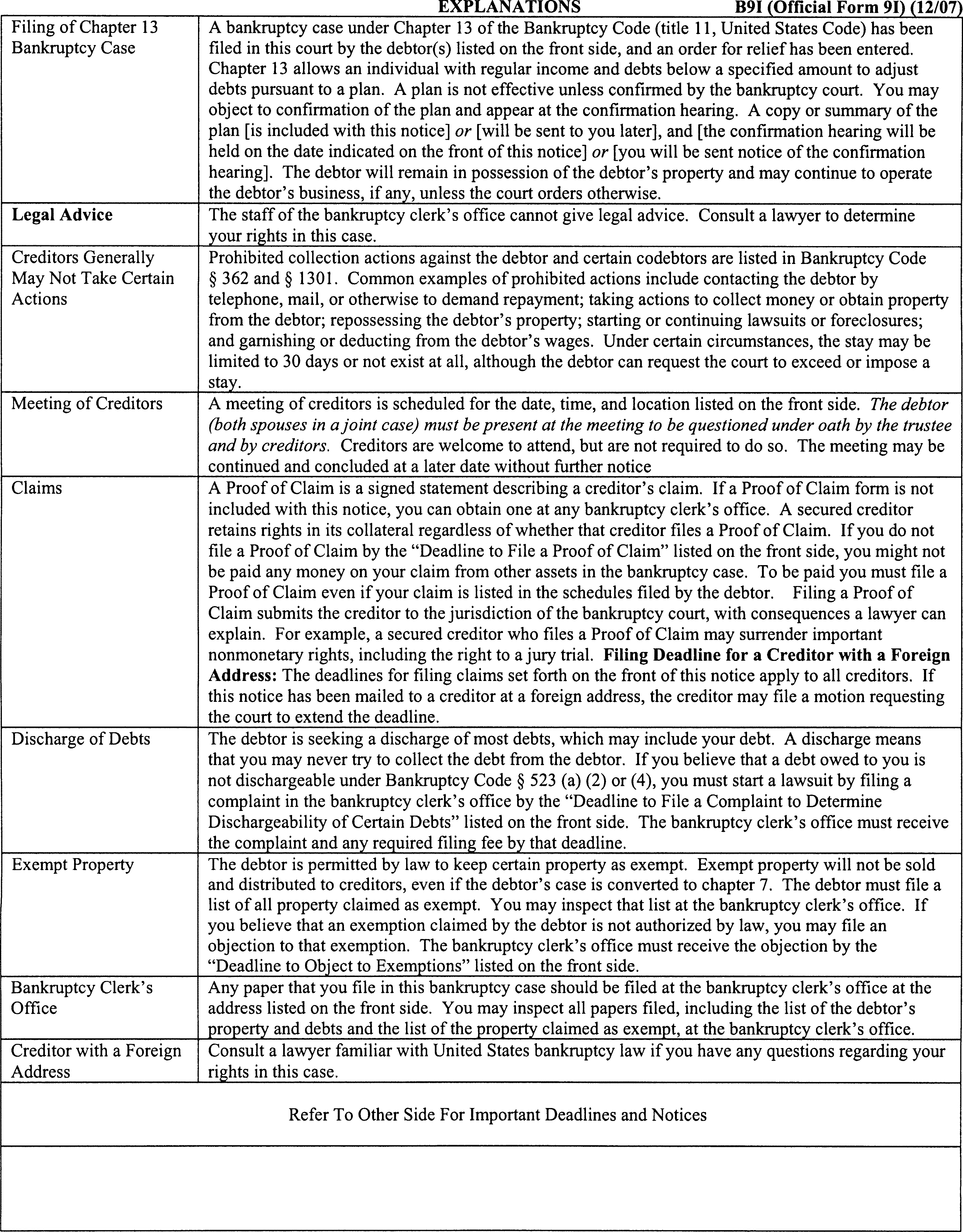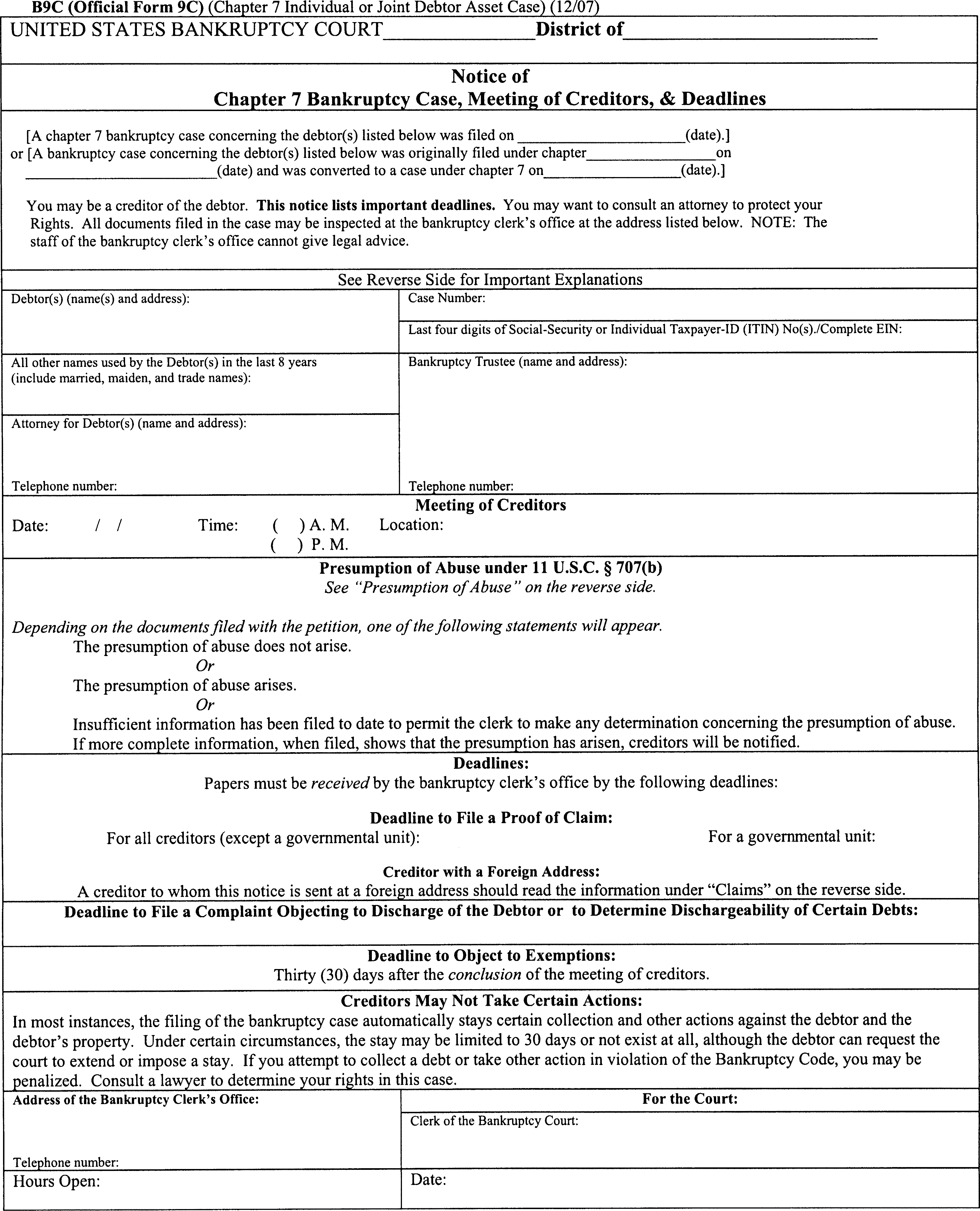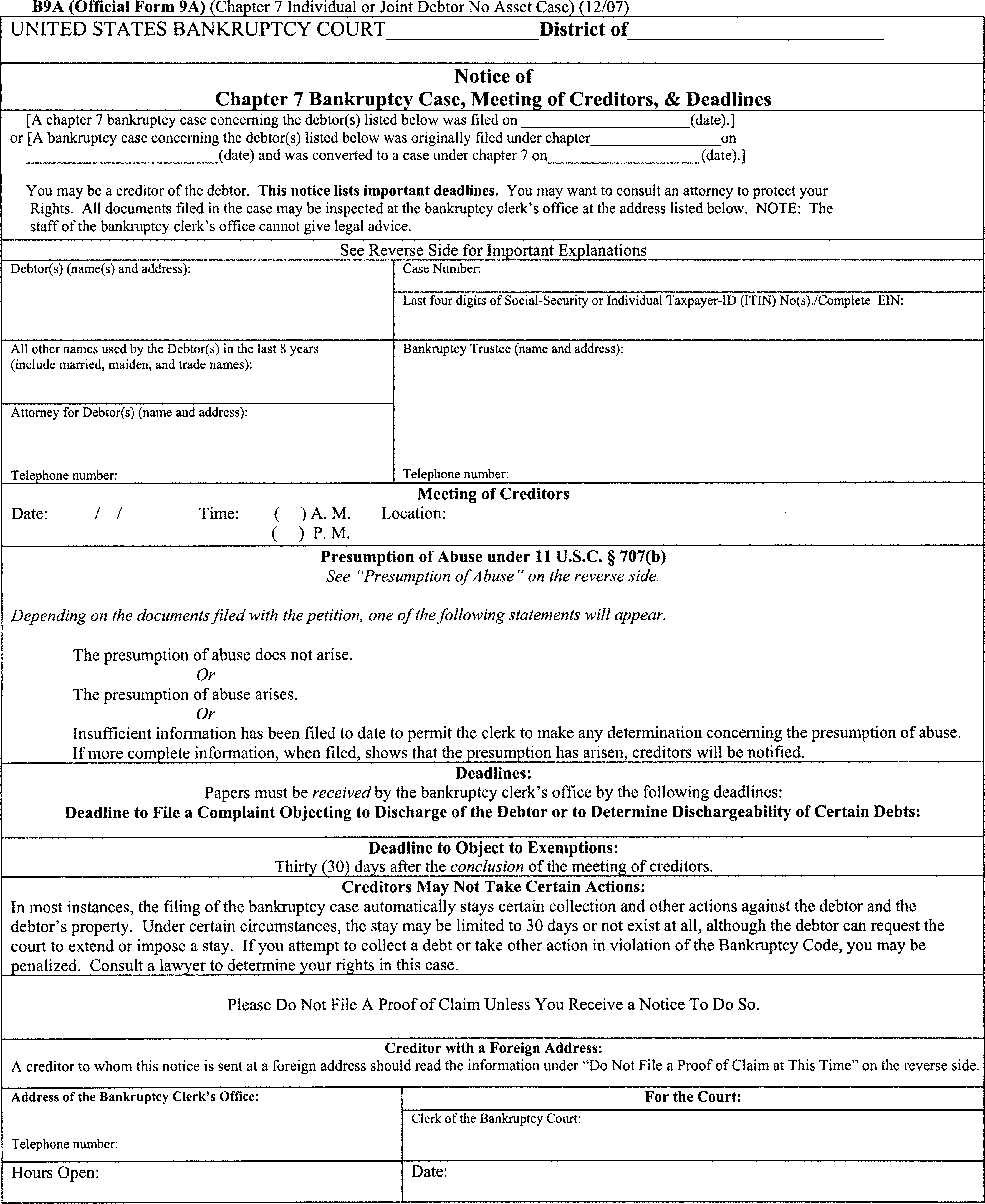 The Chapter 7 form has several unique aspects. The form includes, in the upper right corner of the first page, a check box directing the debtor to state whether or not the calculations required by the form result in a presumption of abuse. The debtor is not bound by this statement and may argue, in response to a motion brought under §707(b)(1), that there should be no presumption despite the calculations required by the form. The check box is intended to give clerks of court a conspicuous indication of the cases for which they are required to provide notice of a presumption of abuse pursuant to §342(d).