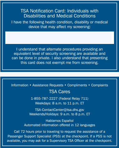 The Transportation Security Administration (TSA) has a "TSA Cares Helpline" to provide travelers with disabilities, medical conditions, and other special circumstances, additional assistance during the security screening process.