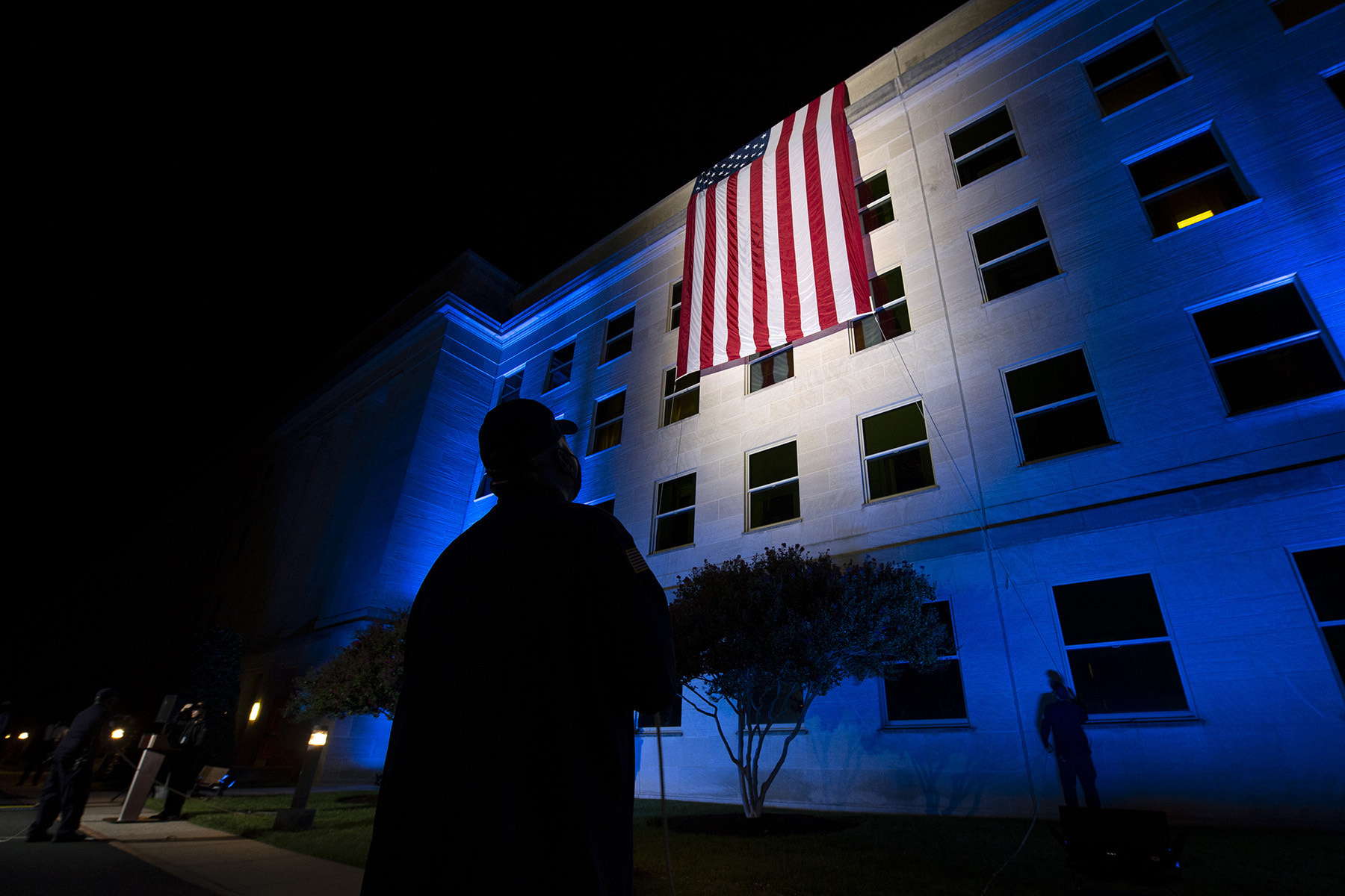 First responders guide an unfurling a flag over the side of the Pentagon before sunrise on the 20th anniversary of the 9/11 terrorist attacks at the Pentagon September 11, 2021 in Arlington, Va. The flag unfurling was a practice run for the official sunrise service. Source: Department of Defense